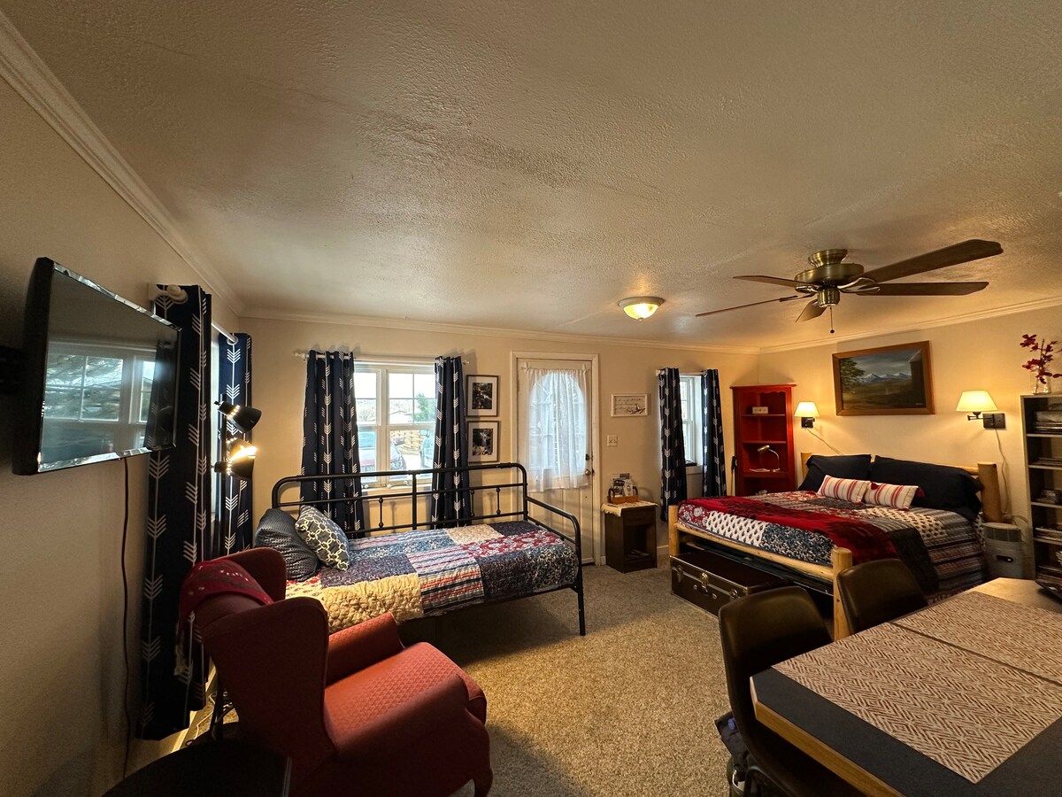 Una casa tranquila de un dormitorio a pocos pasos del centro de Hamilton. Meticulosamente decorada y moderna, la casa tiene un aura de tranquilidad que hará que tu estancia sea muy especial. Después de un gran día de esquí, pasa tiempo relajándote en el patio con el aire fresco de la montaña. Disfruta de un paseo nocturno por el cercano parque del río y contempla una espectacular puesta de sol en la montaña Bitterroot o explora el centro de Hamilton, comiendo y bebiendo en una de nuestras cervecerías locales.