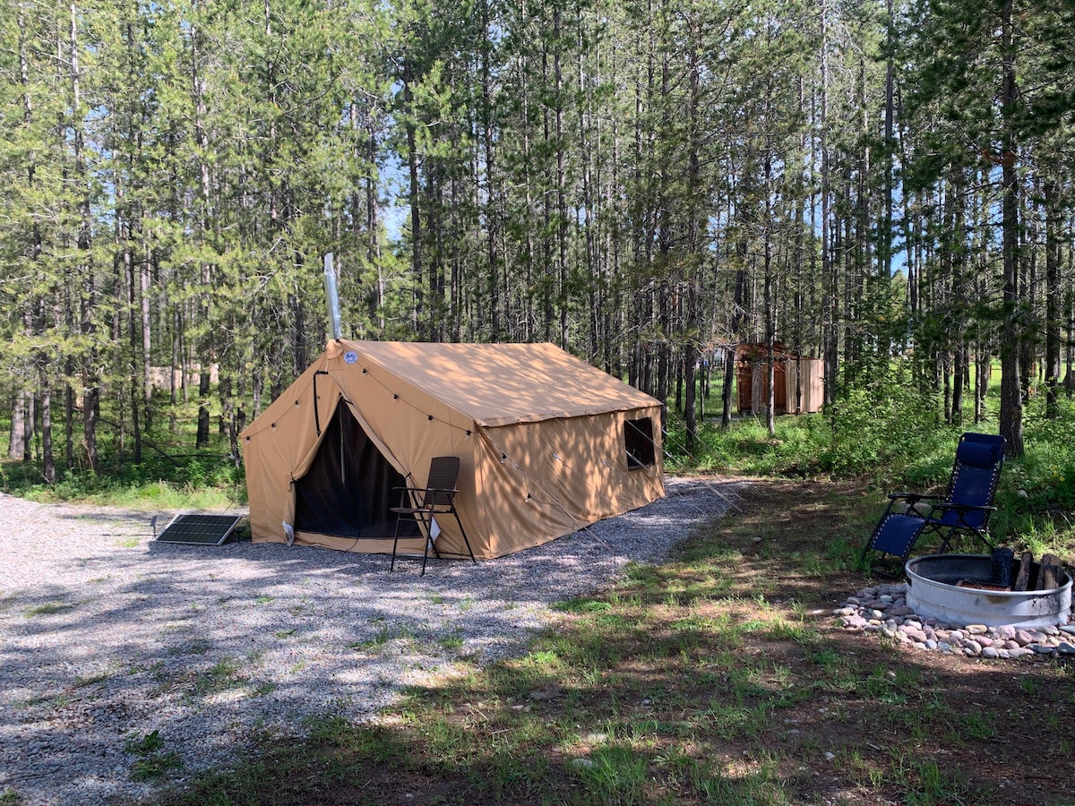 A 7 millas de la entrada oeste del Parque Nacional Glacier, esto es perfecto para parejas que planean pasar la mayor parte de su tiempo en Glacier. ¡Tienda de campaña de pared 12x14 con una estufa de leña para las noches frías! 1,5 acres. Entrada privada, todo cercado. Hay un panel solar para enchufar lo esencial y una estufa de campamento y un anillo de fuego para cocinar. Ofrecemos una nevera y un agua. Hay una letrina con una ducha climatizada con propano. ¡No es para personas con el sueño ligero! El tren llega un par de veces por noche.