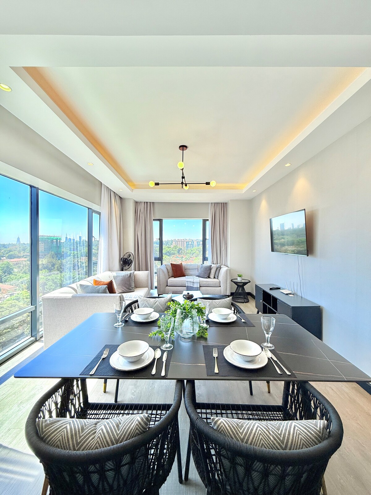 ¡Karibuni! (Bienvenido en suajili) Siéntete como en tu propia casa en este lujoso apartamento totalmente amueblado de 2 dormitorios y 2,5 baños ubicado en Westlands, Nairobi. - Este apartamento del décimo piso ofrece una vista sin obstáculos al horizonte de Nairobi de día y de noche. - A poca distancia a pie de grandes centros comerciales (Sarit Centre y Westgate a 5 minutos), restaurantes, cafeterías y bares. - Espectacular piscina infinita en la azotea, sauna y sala de vapor (+gimnasio) y cancha de squash. - Chocolate Bar, Slate Restaurant y tienda de comestibles en la planta baja.