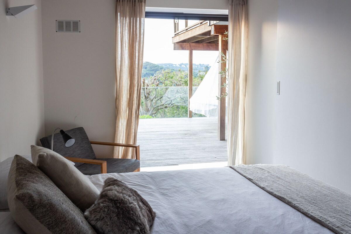 Floor to ceiling views just 10 minutes walk to the beach. This space has the feel of a luxurious cabin with all the amenities of a high-end apartment. Take in the leafy, ocean views in our secluded, self-contained apartment. The sunlit rooms have an easy coastal elegance for relaxing or working while taking in the view.