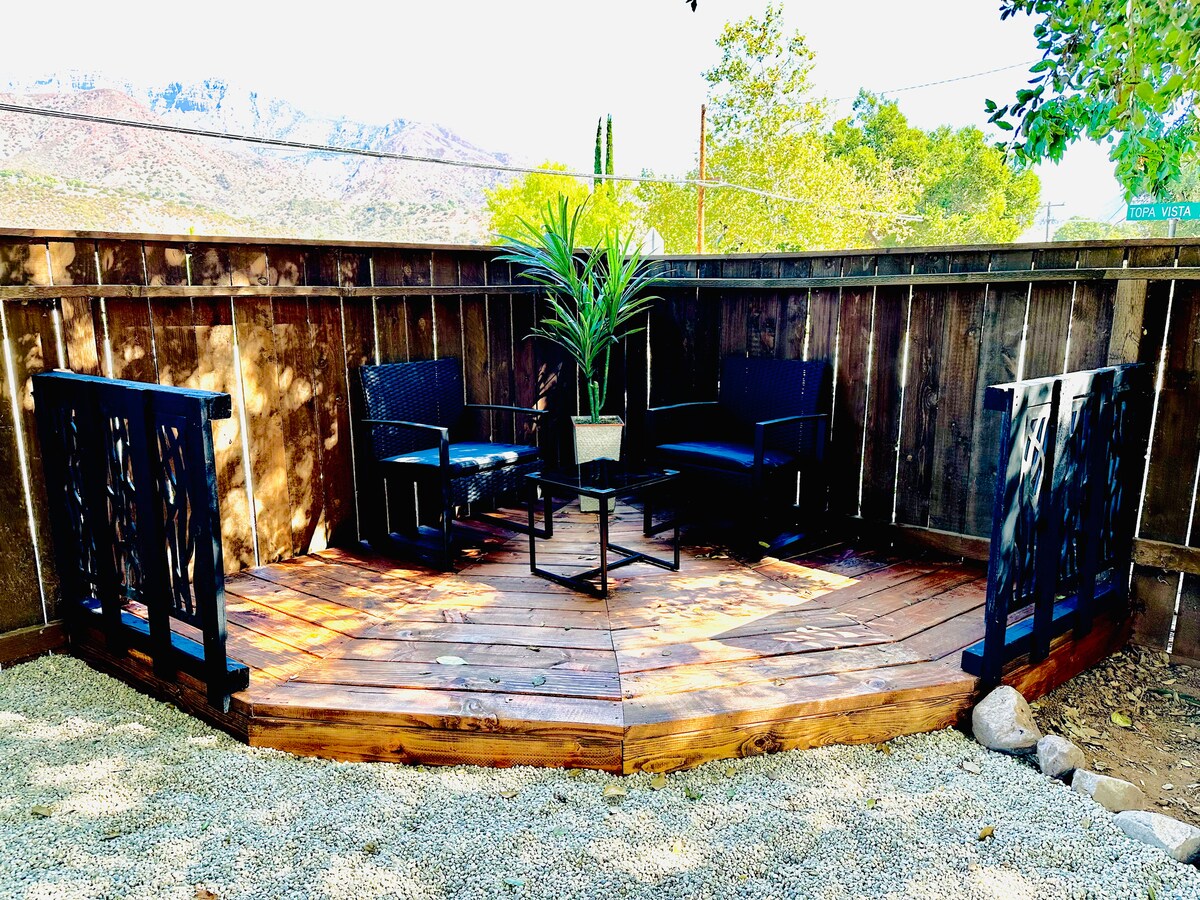 ¡La autopista 33 está ABIERTA para nuestros huéspedes! ¡Desconecta del estresante mundo! Ven a relajarte en este alojamiento de 2 dormitorios y 2 baños de 1200 pies cuadrados. ¡Casa de montaña oculta, fuera de la red, con cubiertas extragrandes, rampa, patio para fogatas, BAÑERA DE INMERSIÓN fría/caliente para 2 personas con IMPRESIONANTES vistas a la montaña de 360 grados! Muy tranquilo, silencioso, PRIVADO y aislado. Rodeado por el Bosque Nacional Los Padres y 2 arroyos (pozo de agua de temporada). Carretera privada con puerta cerrada. A 30 minutos en coche al norte de Ojai, California. Internet satelital STARLINK con wifi. Interior único.