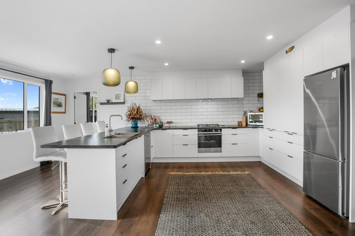 Esta impresionante casa moderna está a solo 150 metros de la hermosa playa de surf de Whangamata, votada como la playa número 1 de Nueva Zelanda en enero de 2018. El alojamiento está en el NIVEL SUPERIOR DE ESTA CASA. Dos dormitorios, baño, salón, comedor y cocina, además de terrazas y amplio garaje doble. Mira las fotos. El nivel inferior no está ocupado. Para familias más grandes o amigos, alquilamos toda la casa como opción y el precio es negociable. La planta baja tiene 2 dormitorios con capacidad para 4 personas, su propio baño, salón y cocina.