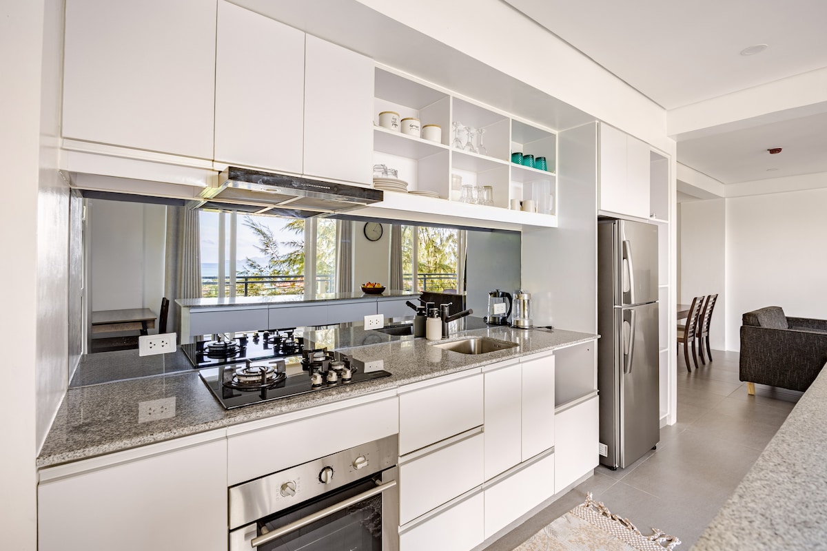 A one-bedroom apartment ideal for families or up to four guests, featuring a bedroom and a flexible living area with two single beds. It includes a dining area and a fully furnished kitchen for added convenience. The unit has three beds, one queen and two singles. It offers a private, quiet setting designed for comfort, relaxation, and privacy throughout your stay.
