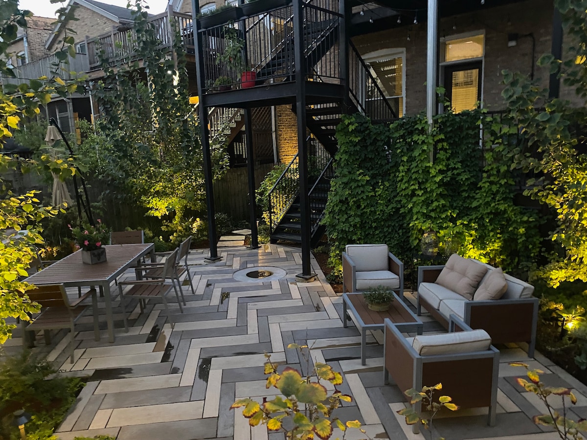 ¡Escápate a este espacioso apartamento en un bullicioso barrio de primera categoría de Chicago! A los huéspedes les encanta este alojamiento porque: - Está rodeado de restaurantes/tiendas de primera categoría. - Está cerca de todas las atracciones populares que hacen que Chicago sea tan genial. - Lujoso interior recién renovado lleno de luz natural. - ¡Planta abierta para el entretenimiento! - ¡2 patios privados! - Wifi rápido (600 mbps). - Dormitorio principal en suite con patio independiente. - ¡Plaza de aparcamiento designada! - A pasos de la estación Damen de la línea azul (800 pies).