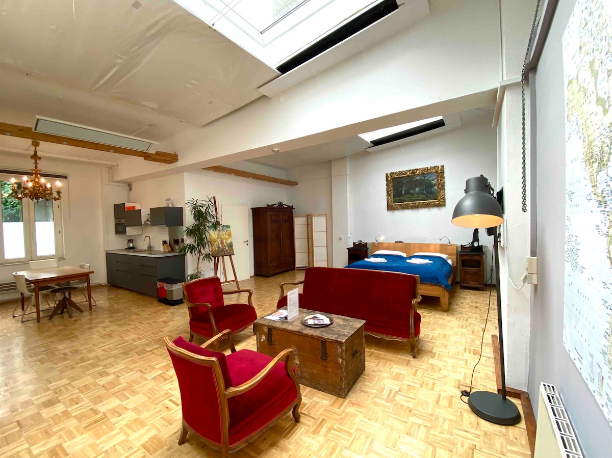 Loft n.º 9 a la izquierda en el antiguo edificio del taller del abuelo. El apartamento es ideal para estancias cortas o largas, se encuentra al final del tranquilo patio interior de la casa de estilo wilhelminiano en la Westbahnstrasse. Vida excepcional, una mezcla de lo antiguo y lo nuevo. Claraboyas con mucha luz desde arriba (que se pueden oscurecer) y vistas despejadas al cielo. Cabina de calor profundo por infrarrojos para relajarse. ¡Un lugar digno de vivir, único en el distrito 7 de Viena!