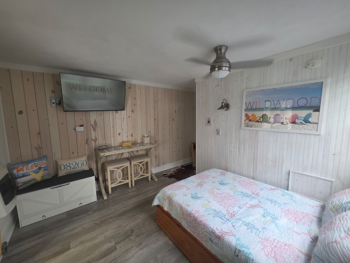 Bienvenido a nuestra casa de playa ubicada en North Wildwood. Recién pintada y decorada para la temporada 2024. ¡No hay calles que cruzar para acceder a la playa y al paseo marítimo gratuitos de North Wildwood! Disfruta sentado en tu porche delantero privado. El dormitorio principal cuenta con una cama tamaño queen. El segundo dormitorio cuenta con dos camas individuales. Sala de estar con sofá cama. Cocina completa y mesa de comedor. Privilegios de piscina y uso de barbacoa en el motel adyacente. Solo tiene capacidad para un máximo de 6 personas. Estacionamiento gratuito para 1 coche. Propiedad para no fumadores. Edad 25+