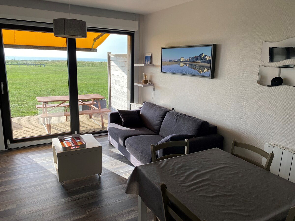 Déjese mecer admirando el mar cómodamente instalado en el sofá del salón... Nuestro apartamento está situado en el sexto y último piso del «Grand Bleu» (accesible por ascensor). Tiene una magnífica vista al mar, lo que le permite admirar por un lado el faro de Boulogne y por el otro, la Costa de Ópalo y los acantilados ingleses si el clima es agradable. El acceso a la playa se realiza directamente al lado del apartamento, con la piscina para niños justo enfrente.