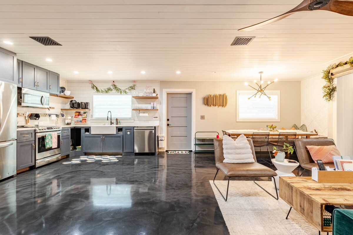 ¡Estudio de los años 50 totalmente renovado (2024) en un barrio seguro y tranquilo de Orlando! Disfruta de una lujosa cama tamaño queen, ducha a ras de suelo, Roku TV y cocina completa con Keurig. Incluye un camino privado, entrada independiente y una acogedora sala de estar con una elegante decoración moderna. Lavadora y secadora en la unidad para tu comodidad. A solo 3 millas del centro, 10 millas de Universal, 8 millas del aeropuerto y 18 millas de Disney, perfecto para parejas o viajeros solos que buscan comodidad, privacidad y estilo moderno en un entorno tranquilo.
