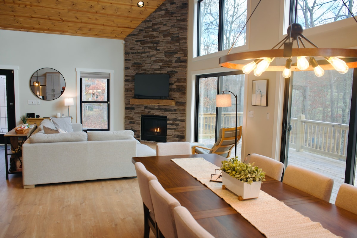 ¡CASA DE NUEVA CONSTRUCCIÓN! ¡Guau! ¡Deep Creek nunca ha visto algo así antes! ¡Es una experiencia única que te ofrece todos los servicios que necesitas para tus MEJORES vacaciones/escapadas/estadías de siempre! Con su combinación única de aspecto rústico y características modernas, ¡seguramente deleitará a todos los huéspedes! Después de un día lleno de diversión en el lago, pescando o navegando, relájate en nuestra cubierta superior mientras observas y escuchas el agua bañar la orilla con una bebida refrescante en la mano. ¿O acabas de regresar de un día vigorizante en las pistas? ¡Relaja esos músculos en nuestro jacuzzi de la cubierta inferior, contemplando las estrellas en el cielo invernal de arriba! ¡Obtienes lo mejor del lago y la montaña en esta joya escondida que admite perros! ¡Imagina las noches disfrutando de la brisa de la montaña mientras asas malvaviscos en nuestro lugar para fogatas! O acurrúcate frente a la chimenea de gas en nuestra gran sala de concepto abierto que permite que todos estén juntos. Pesca y nada desde nuestro muelle privado o utilízalo para amarrar tu propio barco o motos acuáticas. Presencia amaneceres espectaculares mientras remas temprano por la mañana con nuestros kayaks y canoas para 2 personas. Disfruta de un espacio de trabajo privado y bien iluminado con internet de alta velocidad para facilitar tus necesidades de trabajo virtual. ¡También se proporciona una CUNA de madera real y 2 parques infantiles! Además, ofrecemos una EXPERIENCIA DE PELÍCULA AL AIRE LIBRE para que todos nuestros huéspedes disfruten de las mejores vacaciones de su vida. NOTA: Todos los coches/todoterrenos con tracción en las cuatro ruedas son necesarios en los meses de invierno debido a la empinada entrada.