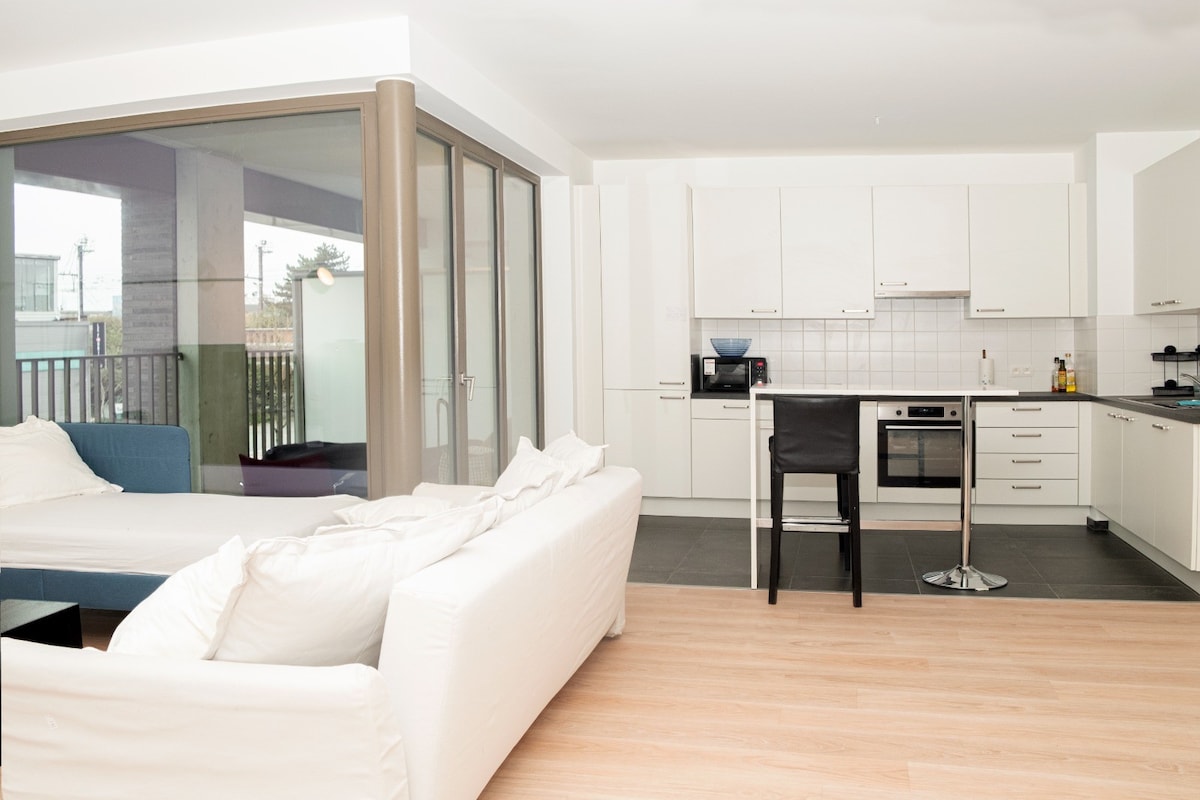 Estudio perfecto con terraza y una hermosa vista. Está bien ubicado cerca del transporte público con flexibilidad: autobús, tranvía, metro o a pie para ir a la ciudad, a 3-5 minutos de la ciudad 2 de compras y a 10-12 minutos de Grande Place, junto a Tour-Taxi y Gare Brussels-North, frente a la casa hay un mini parque (La Ferme Maximilien) que es perfecto para los más pequeños. El parque infantil con un camión de bomberos (Plaine de jeux Harmonie) está a aproximadamente 200 metros de distancia. La plaza Sainte Catherine está a aproximadamente 1 km.