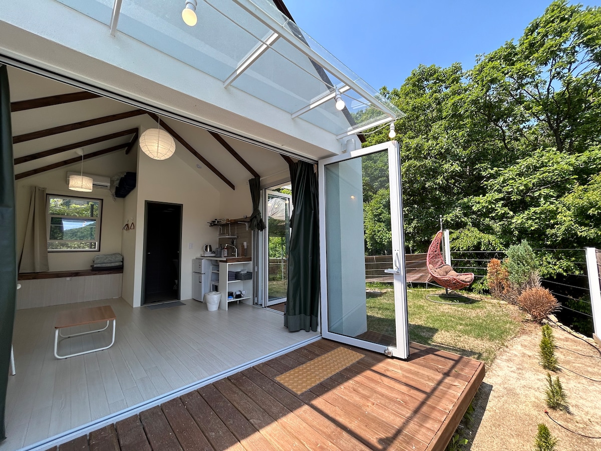 Es una cabaña individual tranquila y aislada ubicada en la cima de una colina en la carretera 59 de Nanhan River, a 10 minutos en coche de Dan Yang. La cabina es un espacio muy pequeño (2m × 3m) Básicamente, se puede utilizar para 1 persona y hasta 2 personas sin coste adicional. Hay una gran ventana con vista al río, un jardín en el patio trasero y un pabellón para descansar. Es una cabaña privada solo para dormir, y el baño y la cocina se pueden usar por separado en la casa de huéspedes en menos de un minuto. Es posible hacer barbacoa, se puede encender el carbón en la parrilla y hay un cargo adicional de 20,000 wones. Ofrecemos sándwiches y café americano hechos con pan de trigo de 8 a 10 horas. No se admiten perros (no hay espacio suficiente). Conectado al estacionamiento, puede estacionar justo al lado de la habitación y es gratis. Disfrute de un descanso relajante en este lugar tranquilo.