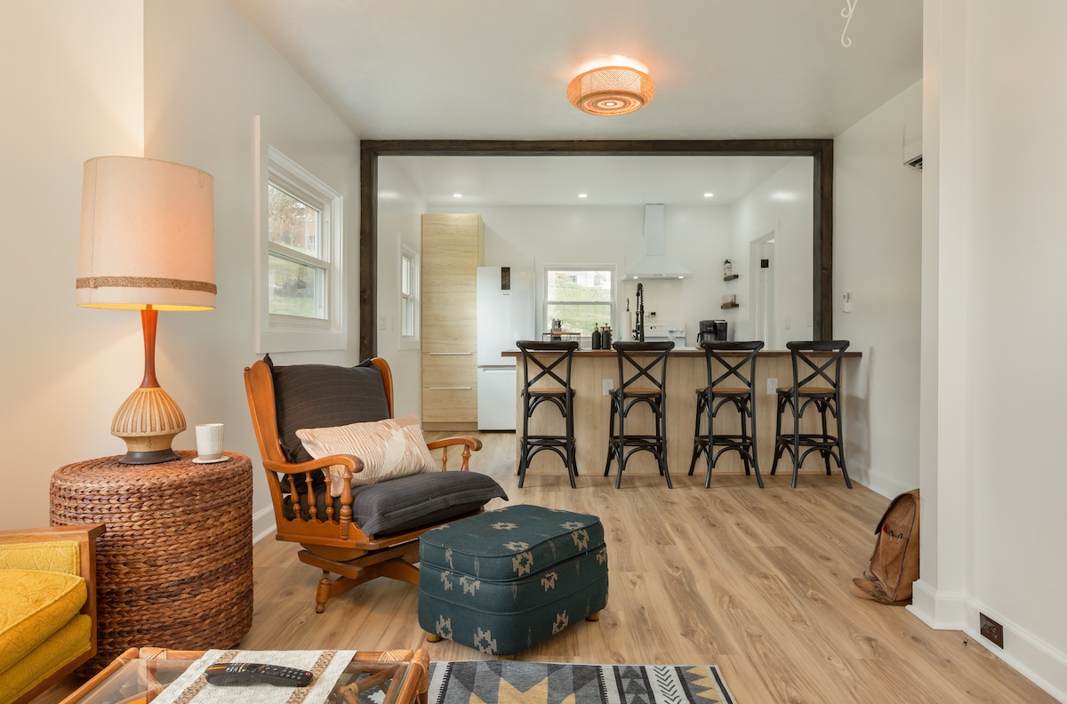 Disfruta de Asheville como nunca antes en nuestro nuevo refugio luminoso y soleado a solo 2,5 millas del centro de Asheville. Relájate en esta alegre morada, a solo 6 minutos en coche del corazón de la ciudad. Ubicado a pocas manzanas del río French Broad, nuestro lugar ofrece acceso sin problemas a los puntos de acceso de AVL: el centro de la ciudad, el distrito de River Arts, Biltmore y West AVL. ¡Tu base perfecta para una aventura en Asheville! Centro de Asheville a 6 minutos en coche. Biltmore a 12 minutos. Río French Broad a 1 min. New Belgium Brewing a 5 minutos