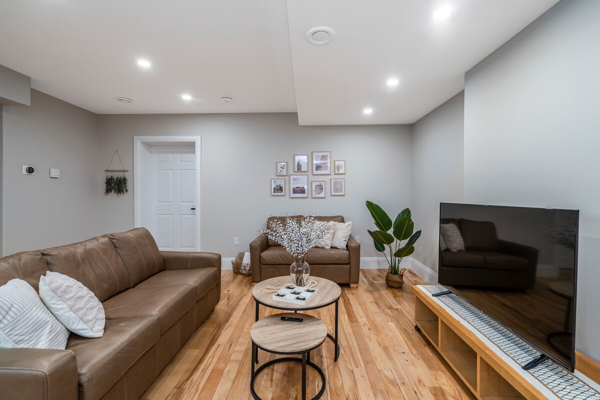 ¡POR FAVOR, LÉELO! Mt. St. Louis y Horseshoe Valley a la vuelta de la esquina! Esta es una SUITE DE INVITADOS luminosa, grande y privada (apartamento en el sótano). Bañera de hidromasaje, patio, chimenea y sendero aislado en el bosque para disfrutar de la naturaleza. La cocina está equipada con una placa de inducción y todas las cosas necesarias, incluso un abridor de botellas de vino :) Sala de estar/cocina/comedor de concepto abierto con TV y Roku. El dormitorio es una obra de arte: ¡oscuro, misterioso y romántico! Cama tamaño queen personalizada hecha de madera de granero desgastada recuperada de nuestra propiedad.