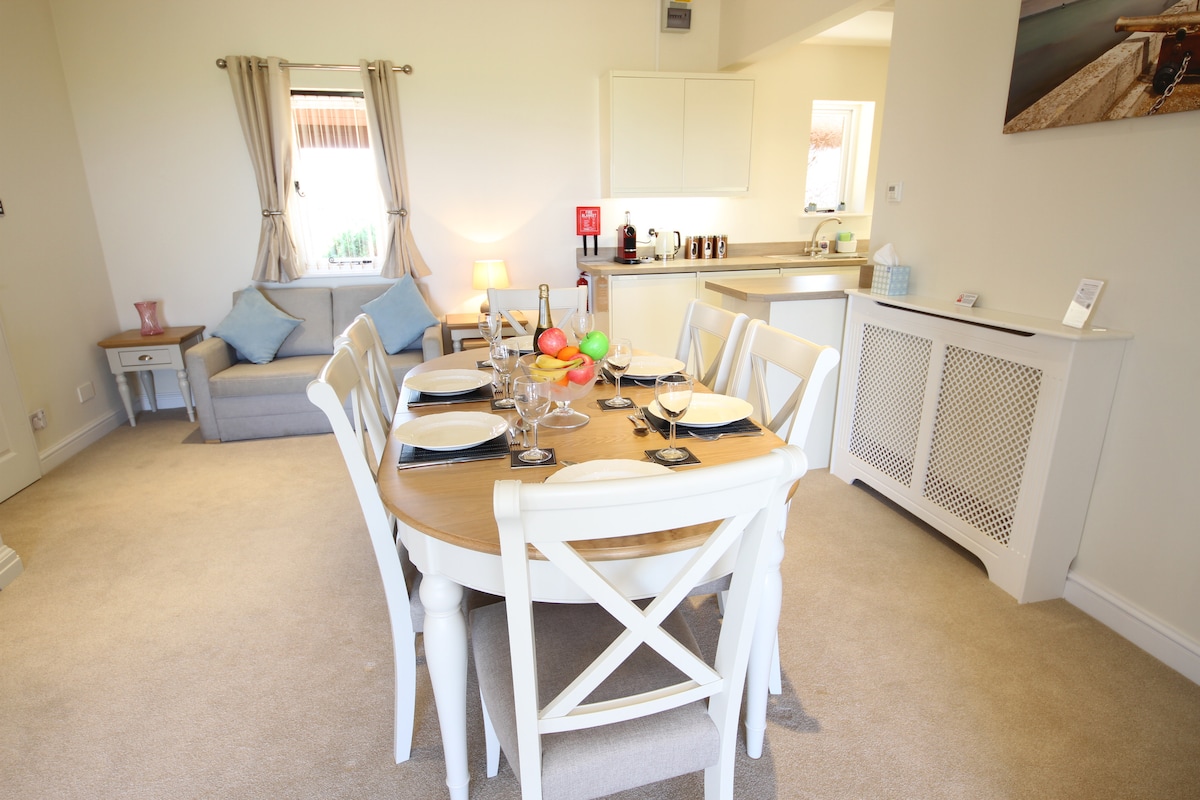 Needles' View at Chale Bay Farm es un apartamento independiente con aire acondicionado para familias con impresionantes vistas a las agujas. La sala de estar cuenta con una cocina contemporánea de planta abierta totalmente equipada con horno, vitrocerámica, microondas, nevera, congelador, lavavajillas y lavadora/secadora combinada y comedor adyacente y salón/solárium. Capacidad para 4 personas (o 5 con sofá cama o cuna), pero puedes añadir más espacio reservando nuestra habitación independiente Tennyson View o uno o más de nuestros otros apartamentos adyacentes.