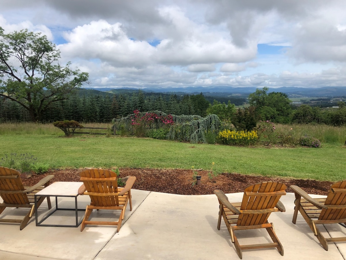 Relájate en tu casa de huéspedes privada con sauna interior y Marquis Spa (bañera de hidromasaje). Disfruta de la piscina y la bañera de hidromasaje al aire libre. ¡Juega al golf en las cajas de salida, juega al chip alrededor de 2 hoyos, explora nuestra propiedad de 10 acres, disfruta de la tranquila vista del huerto de avellanas, los campos de heno y las montañas mientras te relajas y te enamoras de la región vinícola de Oregón!