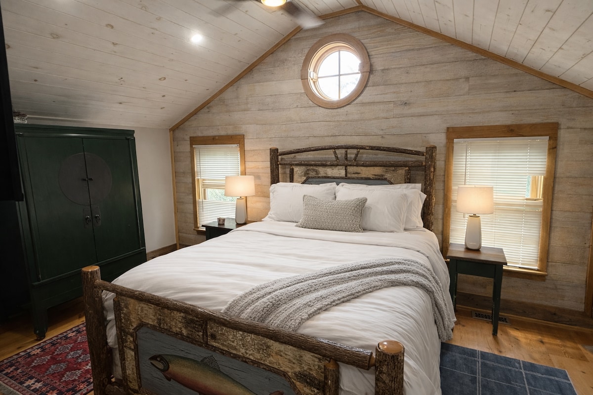 Entra en este dulce y romántico dormitorio del primer piso a través de encantadoras puertas francesas. Escóndete en un lugar romántico para relajarte en una cama tamaño queen con sábanas frescas y frescas del campo rodeadas de una alcoba de vidrieras que te dará la sensación de la era de 1920. Tendrás acceso a la terraza delantera donde disfrutarás de vistas al jardín, así como a los amaneceres sobre el precioso lago Seneca. Hay un baño climatizado con ducha para dos y una habitación independiente con inodoro. Una mesa acogedora con dos sillas es un lugar perfecto para tomar un café por la mañana. Disfruta de otras dos sillas relajantes con lámpara para leer o ver la televisión. Un armario con espejos, tiene cajones y espacios colgantes.