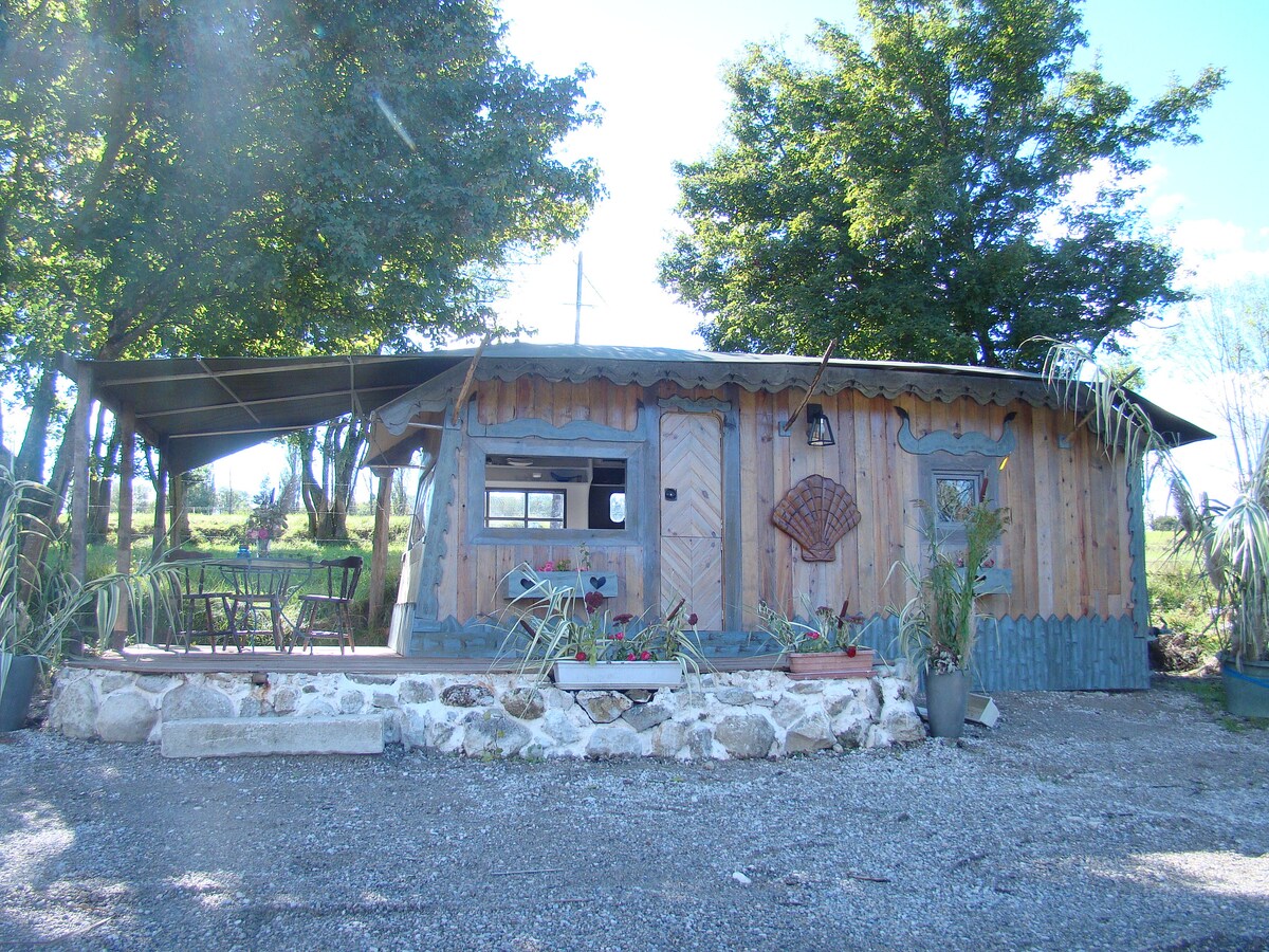 Pequeño CHALET de madera maciza de montaña de un solo piso, tranquilo, en el huerto de manzanas en el corazón de la dulzura del Bugey...sus pueblos, viñedos, cascadas y lagos. Cocina/baño privados. Vistas abiertas al Colombier -La Dent du chat y el Mont Blanc, en una gran propiedad ¡VISTAS de 360 grados! Todo confort para una pareja. Ropa de cama y toallas incluidas. Centro de la ciudad a 15 minutos andando. A su disposición para una HERMOSA ESTANCIA frutas del huerto, zumo de manzana y verduras.
