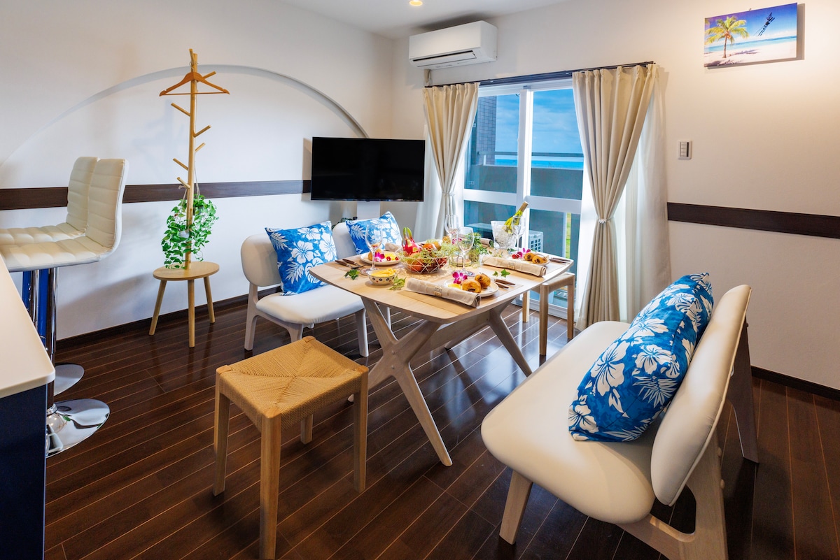 🌅 Disfruta de un momento especial en un apartamento con unas vistas magníficas del amanecer y el mar en Okinawa. Amplio 2LDK para hasta 8 personas.Hay dos dormitorios con cuatro camas semidobles y un cargador disponible en cada habitación.Se incluye una plaza de aparcamiento privado gratuita. * Cuando 8 personas usan la cama semidoble, será compartida por 2 personas, por lo que puede sentirse un poco apretada para los adultos. Equipado con wifi de alta velocidad y 2 escritorios, es ideal para el trabajo a distancia y las estancias largas.La cocina está totalmente equipada con utensilios de cocina, platos, microondas, horno, etc., y es cómoda para prepararse las comidas. Ofrecemos una cuna, bañera y silla para bebés.Avísanos con antelación si quieres usarlo 👶 [Equipamiento/servicios principales] ・ Wifi de alta velocidad/Aire acondicionado/TV de 55 pulgadas/Altavoz Bluetooth ・ Cocina (nevera, microondas, horno, hervidor de agua, enfriador de vino, etc.) - Lavadora (con detergente y suavizante)/secadora Champú, acondicionador, jabón corporal ・ Toallas (para el número de huéspedes)/cepillos de dientes, algodón, bastoncillos de algodón, etc. ・ Plancha de vapor/aspiradora/lavadora - Terraza (con mesa y sillas)
