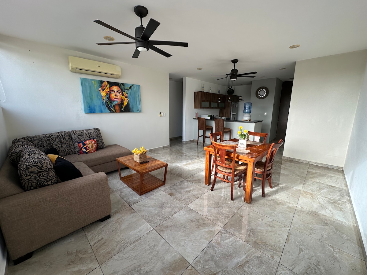 Ubicado en planta alta el Depto Cuenta con sofácama en la sala, un comedor con cuatro sillas, la cocina cuenta con refrigerador, estufa, platos, vasos, tazas, cubiertos, jabón para platos, horno de microondas, utensilios de cocina, sartén, etc; en la habitación cuenta con una cama matrimonial con su juego de sábanas, un buró, televisión con Pluto TV, aire acondicionado y un baño completo con closet vestidor.