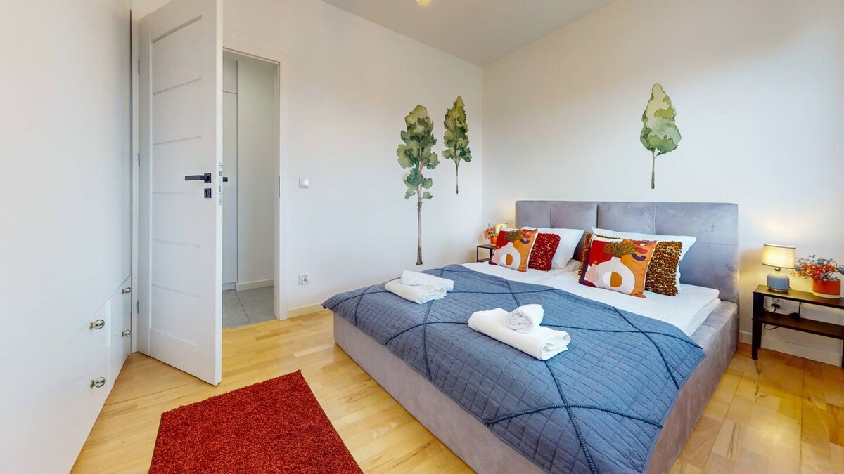 Komfortowy, w pełni wyposażony apartament w nowym budynku. Salon z otwartą kuchnią podzielony na część jadalną i wypoczynkową. W sypialni znajduje się duże łóżko i przestronna szafa. Jest także garderoba jako dodatkowe miejsce do przechowywania. W okolicy znajdują się sklepy, restauracje i kawiarnie Wyposażenie: klimatyzacja, ekspres, czajnik, żelazko, deska do prasowania, pralka Dojazd z Lotniska Chopina 20 min taxi 50 min komunikacja z Lotniska Modlin 50 min taxi 120 min komunikacja
