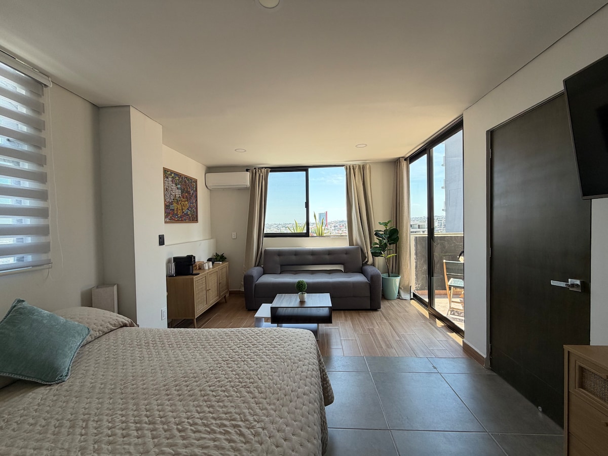 Loft moderno con terraza y vista a la ciudad, a solo unas cuadras del Jardín de San Marcos. Ubicado en un edificio tranquilo y nuevo, ideal para disfrutar Aguascalientes caminando. Cuenta con: • Cama king size • Sofá cama adicional • Terraza privada con vista a la ciudad • Cocina equipada • Lavadora • Smart TV y WiFi • Balcón Caminando del centro y cerca de donde se celebra la Feria de San Marcos. Contamos con varios deptos en el mismo edificio, ideales para grupos que quieren estar cerca.