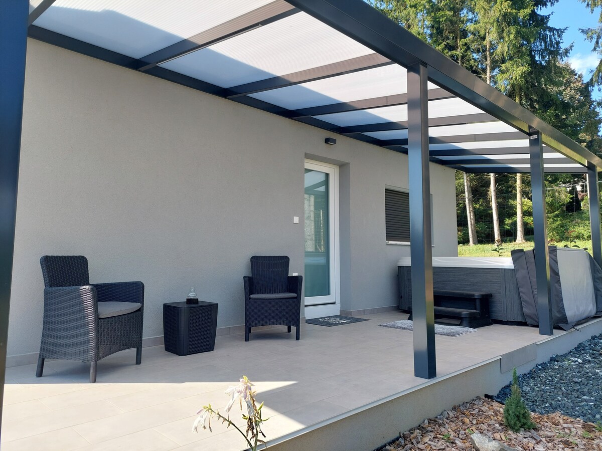 Ubicada en los pintorescos alrededores de Zalaegerszeg, Alsóerdő Villa Resort combina la tranquilidad de la naturaleza y el lujo moderno. El bosque verde y el jardín cuidadosamente diseñado son el lugar perfecto para relajarse y caminar. La espaciosa terraza ofrece un panorama forestal y el área de bienestar privada garantiza una relajación total. Dos dormitorios, dos baños, instalaciones premium y un garaje de dos paradas proporcionan comodidad. ¡Reserva ahora y disfruta de la tranquilidad del lujo!