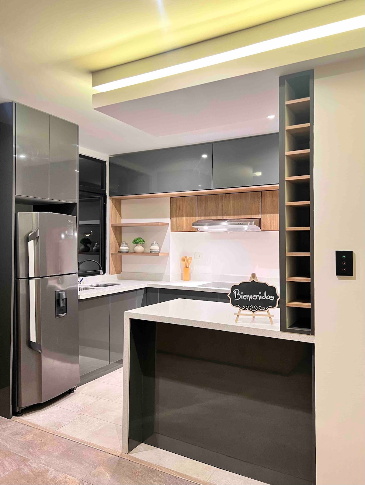 Este acogedor mini departamento ubicado en la planta baja tiene su propio estilo minimalista, dispone de entrada y salida independiente para que durante la estadía tú y tus acompañantes puedan entrar y salir a la hora que estimen conveniente, cuenta con una habitación, un cuarto de cocina equipado y baño privado con ducha de agua caliente.