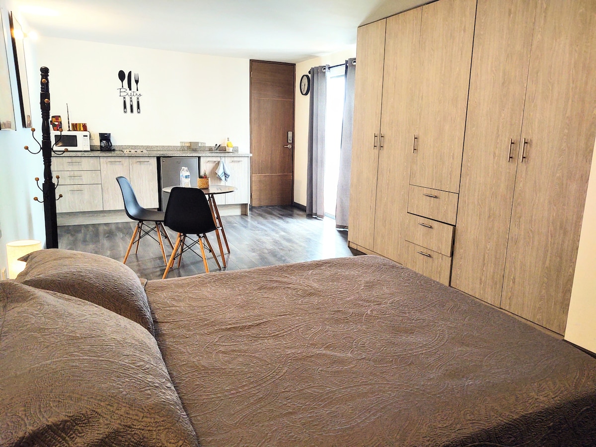 Departamento tipo Loft pequeño con todo lo necesario para una estancia placentera -Cocina Privada con Parrilla, Refri, Micro, Utensilios; ahorra y haz tu super -Baño Privado pequeño y espacioso -Escritorio Amplio y Wifi Veloz, trabaja desde aquí -Cama Matrimonial, descansa y ve la Smart Tv en un colchón confortable -Espacio Suficiente, guarda ropa doblada o colgada -Ventanas Amplias, gran iluminación y ventilación Gran Ubicación para Turismo, Viaje de Trabajo, Estudiantes o Salida en pareja