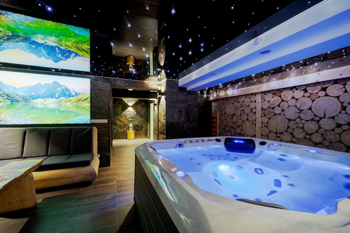 Grand Chalet to luksusowa willa o powierzchni 250 m2 w sercu Podhala z panoramicznym widokiem na Tatry. Na gości czekają: 4 klimatyzowane sypialnie, 4 łazienki, jacuzzi z widokiem, sauna, sala gier z bilardem i PS5, strefa fitness, gabinet do pracy ze światłowodem, kącik dla dzieci, kominek i całoroczny grill. Willa oferuje komfortowe zakwaterowanie dla 10 osób. Idealne miejsce na rodzinny wypoczynek, spotkania z przyjaciółmi czy workation – komfort, nowoczesność i wyjątkowy klimat w jednym.