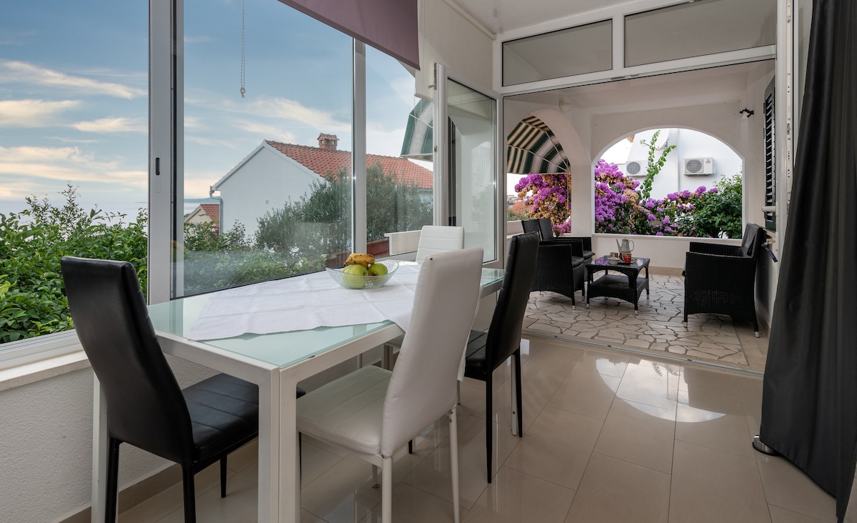 Enyoj this spacious and sun-field apartment designed to make you feel at home. The proximity of the beach 60 m, incredible and open view of the blue sea and sky and all the necessary facilities with which the apartment is equipped, allow the guest to have an ideal vacation from busy everyday life. The proximity of the city of Trogir 4 km, the city of Split 30 km and airport Split 8 km are within easy reach. All this makes this place an ideal place for your beautiful and relaxing vacation.