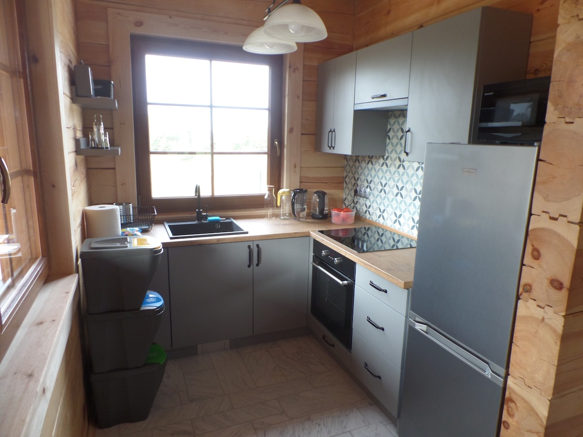 La casa tiene dos habitaciones en la primera planta y un amplio salón en la planta baja, un baño con ducha y una cocina totalmente equipada. Una amplia terraza, donde hacer una barbacoa debería ser un gran placer, y los huéspedes tienen a su disposición una sauna y una bañera de jardín con vistas al bosque. La zona de SPA está ubicada de tal manera que se mantiene la privacidad y los huéspedes no se sienten cohibidos. La casa está climatizada y se encuentra cerca del lago y la playa.