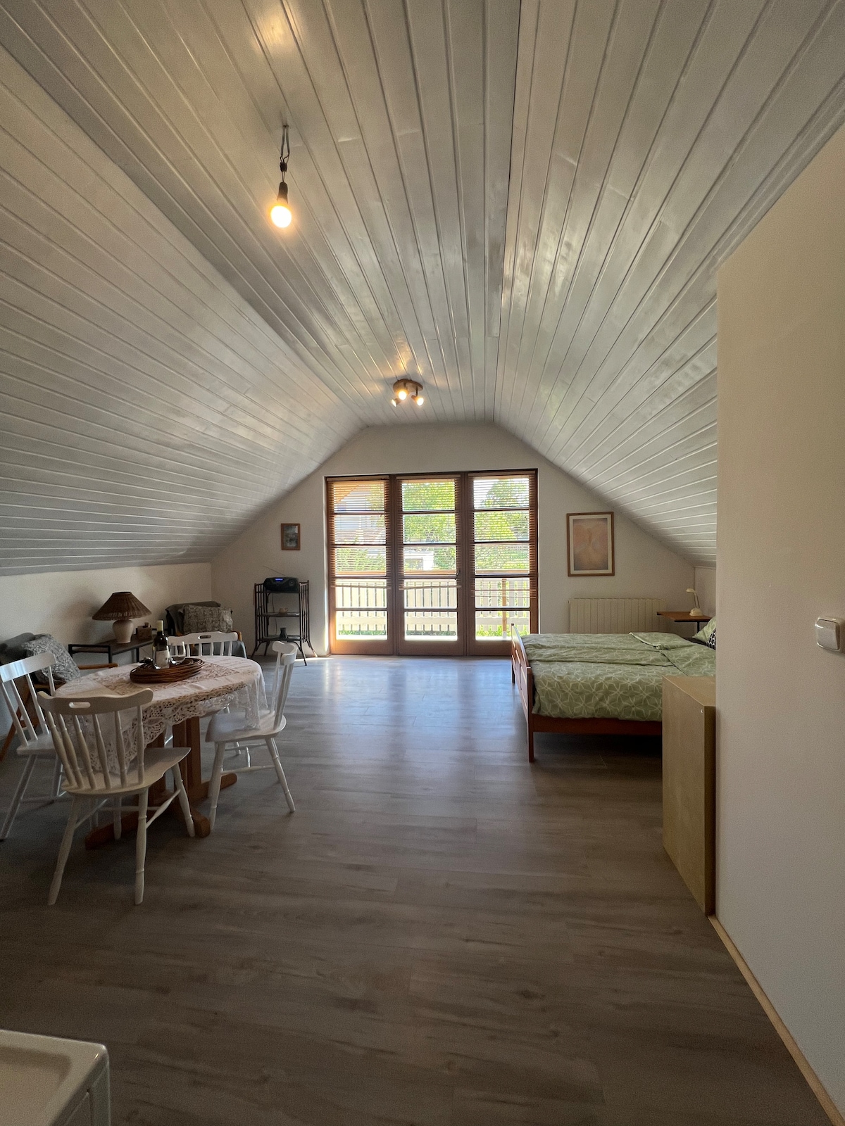 The house is totaly unique. 3.13 x 3.23 m2, but 2 stocks - ground with bathroom - 1st floor kitchen and dininig room - 2nd floor bedroom (Queen size bed - big enough for two 180cmx160cm) and entry to balcony Here are some stairs in the house. Electrical heating in every room. Here is enough space only for two people.