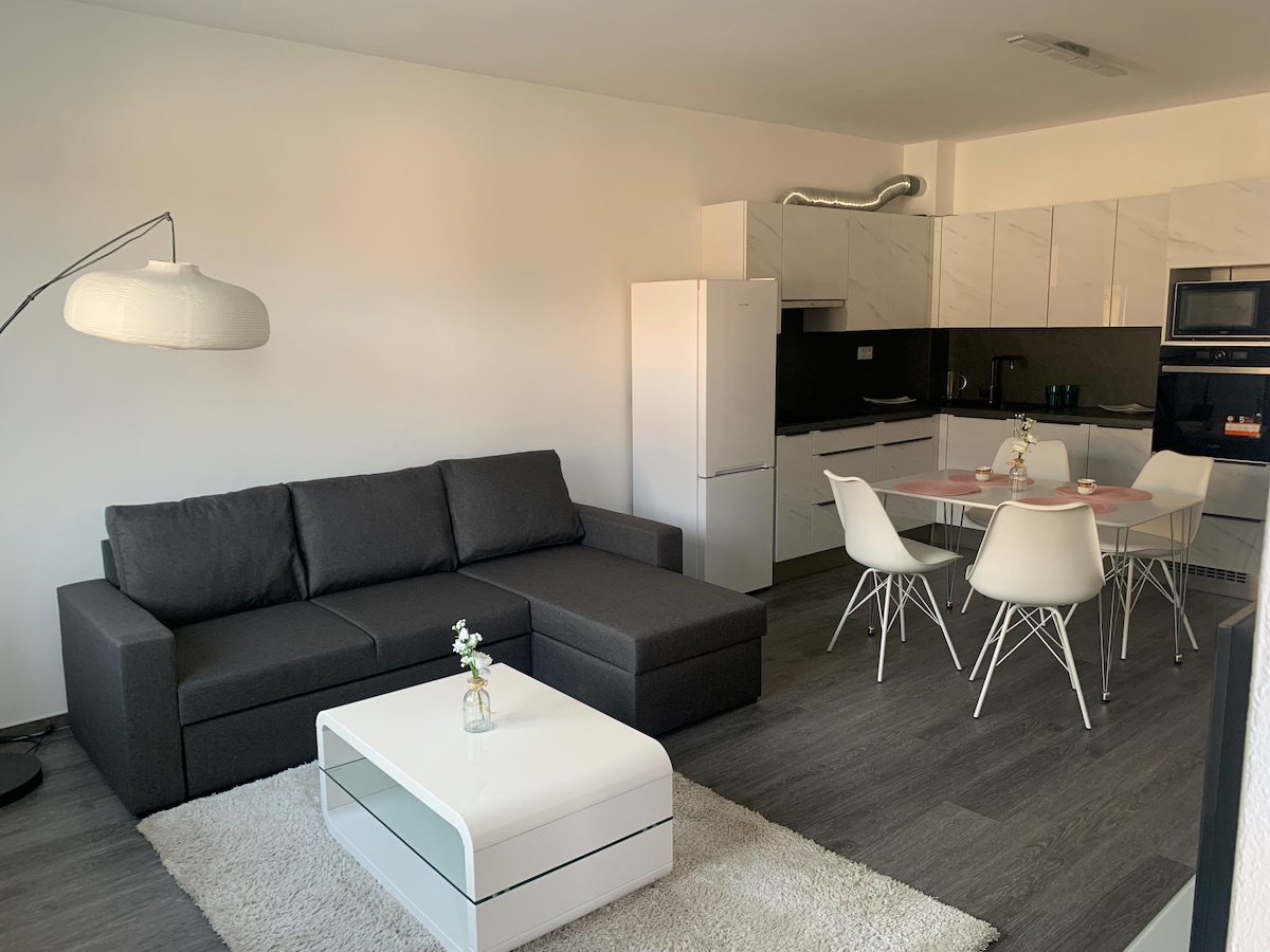 Welcome to our Modern apartment in Znojmo. From the 6th floor, you'll enjoy a beautiful view of the city. 52m² apartment has two rooms: living room with TV, desk, and pull-out sofa (190x120), and separate bedroom with bed (200x180). Kitchen is equipped with built-in appliances, cookware, bar, and coffee machine. There's bathroom with shower and separate WC. Bedroom is air-conditioned, and living room has ventilation. Trip tips: Znojmo's historic center, Vranov nad Dyjí, NP Thaya.
