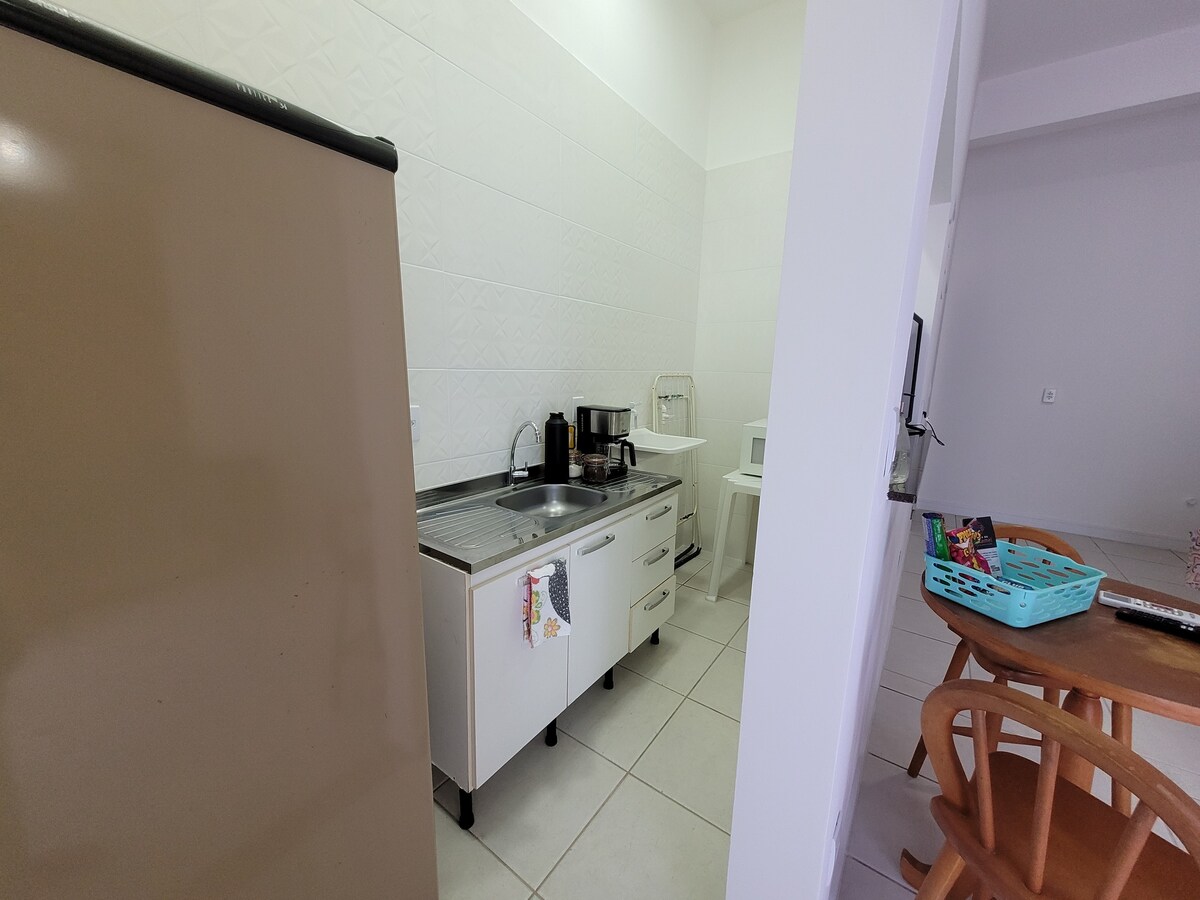 Apartamento/loft en el centro de Blumenau. Garaje privado. Condominio con ascensor, hall de entrada. Privado, 1 cama doble, ropa de cama completa, manta, almohadas. Cocina, minibar, cafetera, microondas, cocina eléctrica, sandwichera, licuadora, vajilla y cubiertos para dos personas. Aire acondicionado, cortinas opacas, TV, secador de pelo. Baño completo con toallas de baño y cara. Espacio de oficina en casa, con 2 sillas, 1 sillón. Wi-fi privado.