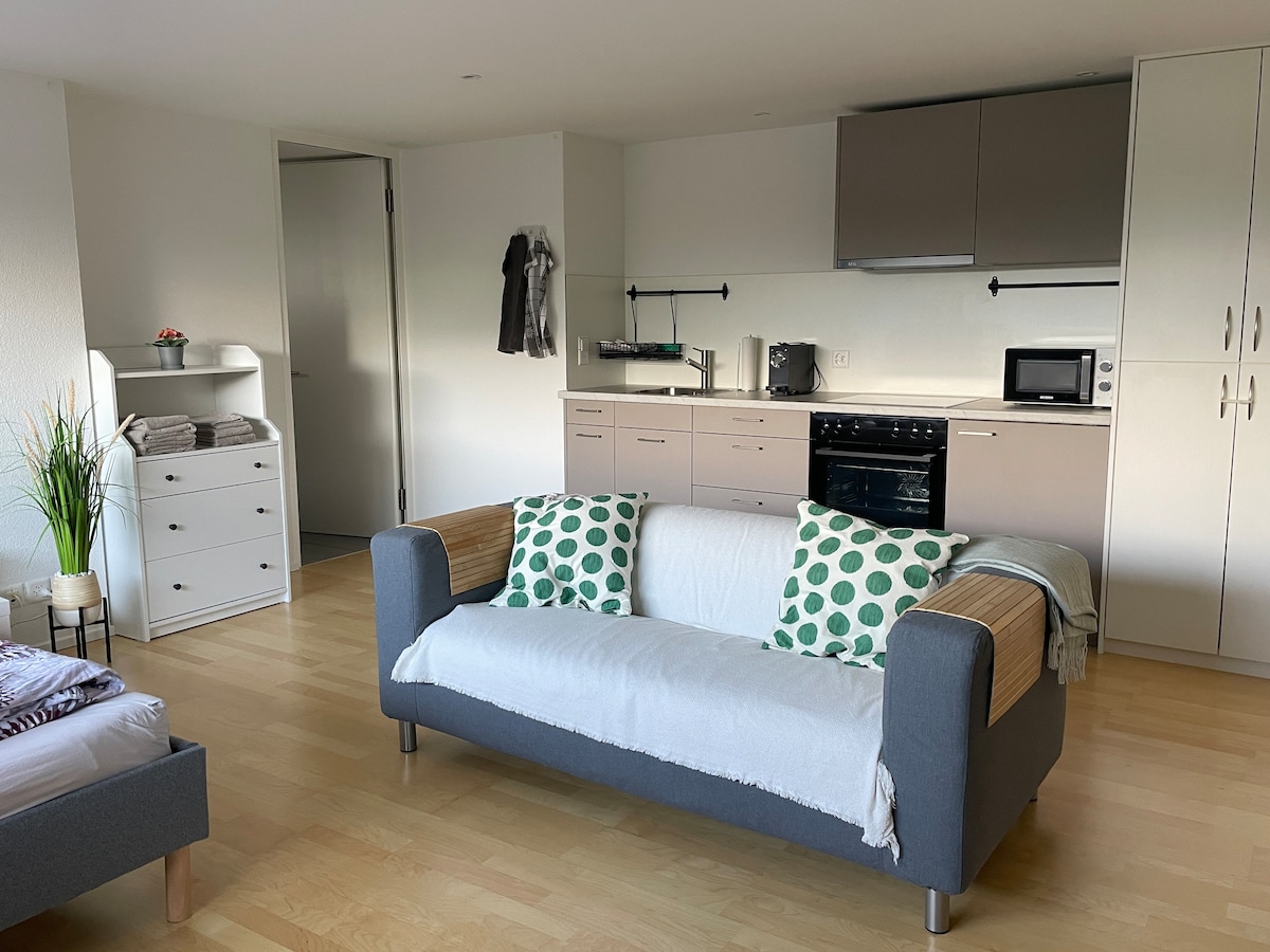 HOME PRISKA - Ferien / Arbeit in Baar/Zug inklusive Parkplatz Neuere Parterre 1-Zimmer Wohnung. Eigene Ladestation E-Fahrzeug. Eigener Eingang über kleine ebenerdige Terrasse. Wohnung 35 m2. Abtrennbarer Schlafbereich (Glasschiebewand), modernes Badezimmer mit Closomat, Bodenheizung Neue Küche (mit Geschirr + Pfannen) mit Steamer, Geschirrspüler, Kühlschrank, Keramikherd, Kaffeemaschine inkl Kaffeekapseln. HD Fernseher, WLAN, Swisscom-TV Replay. Langer Parkplatz vor Wohnung. Ruhig+ zentral.
