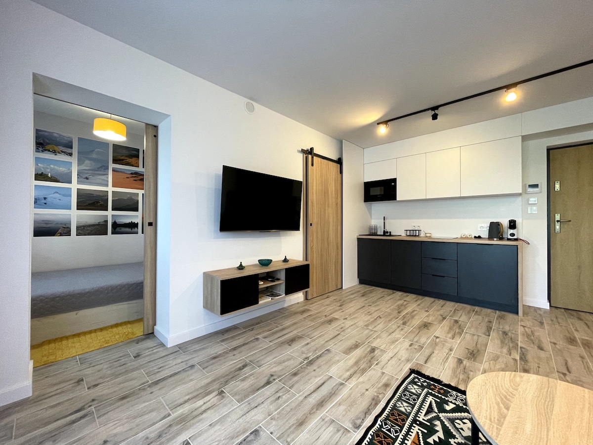 Un moderno apartamento de un dormitorio con una amplia sala de estar con una pequeña cocina, un balcón y un baño equipado con una ducha y una lavadora. El apartamento se encuentra en un complejo situado a orillas del lago Żywiec, donde los huéspedes pueden utilizar la sauna, el gimnasio y el restaurante del complejo.